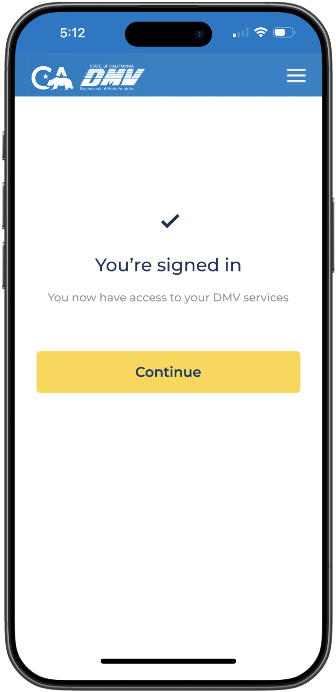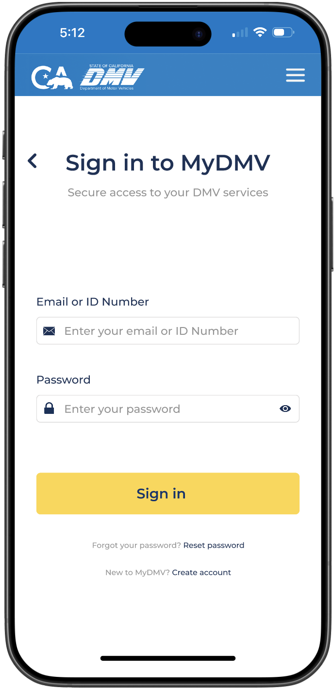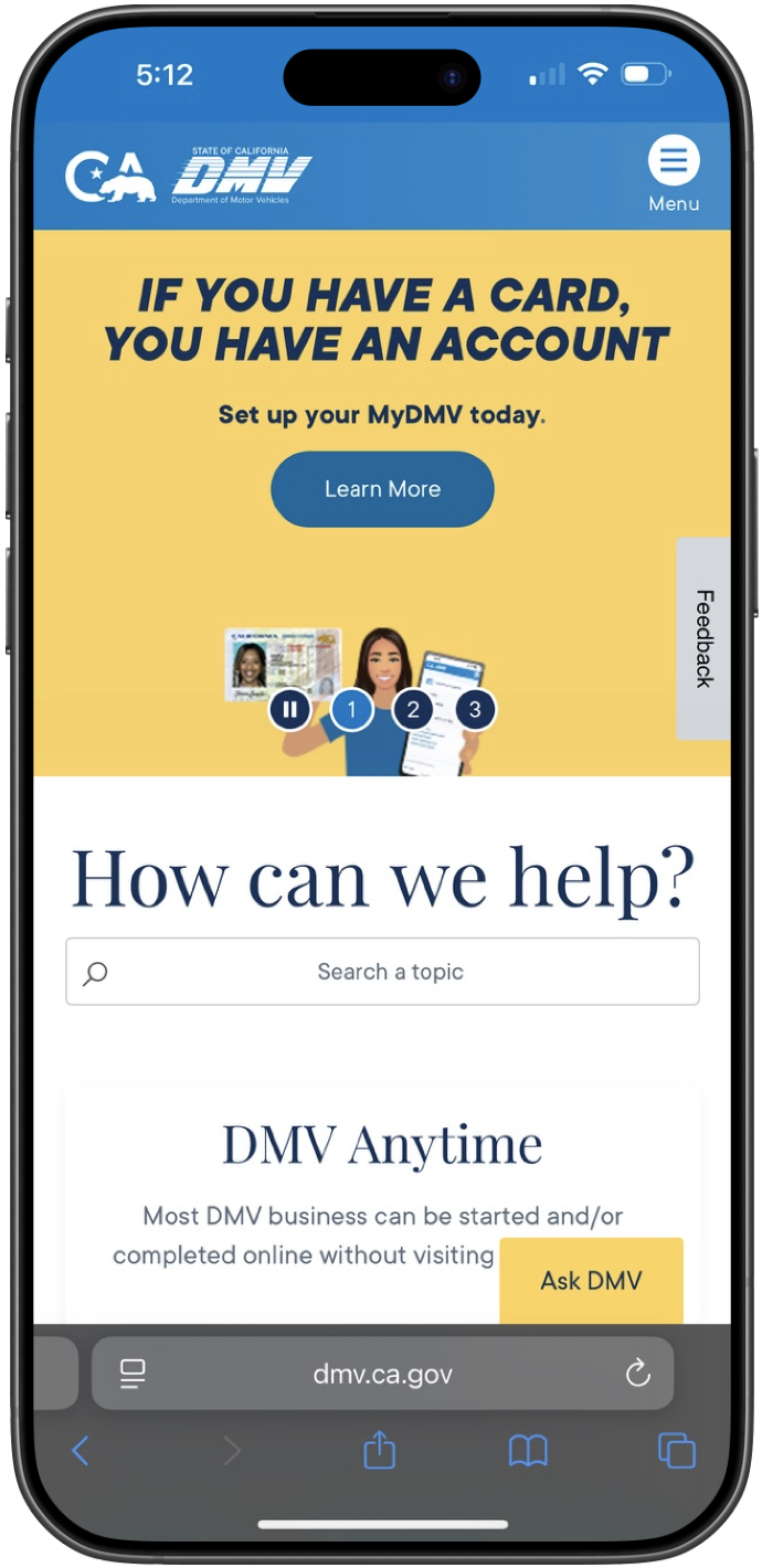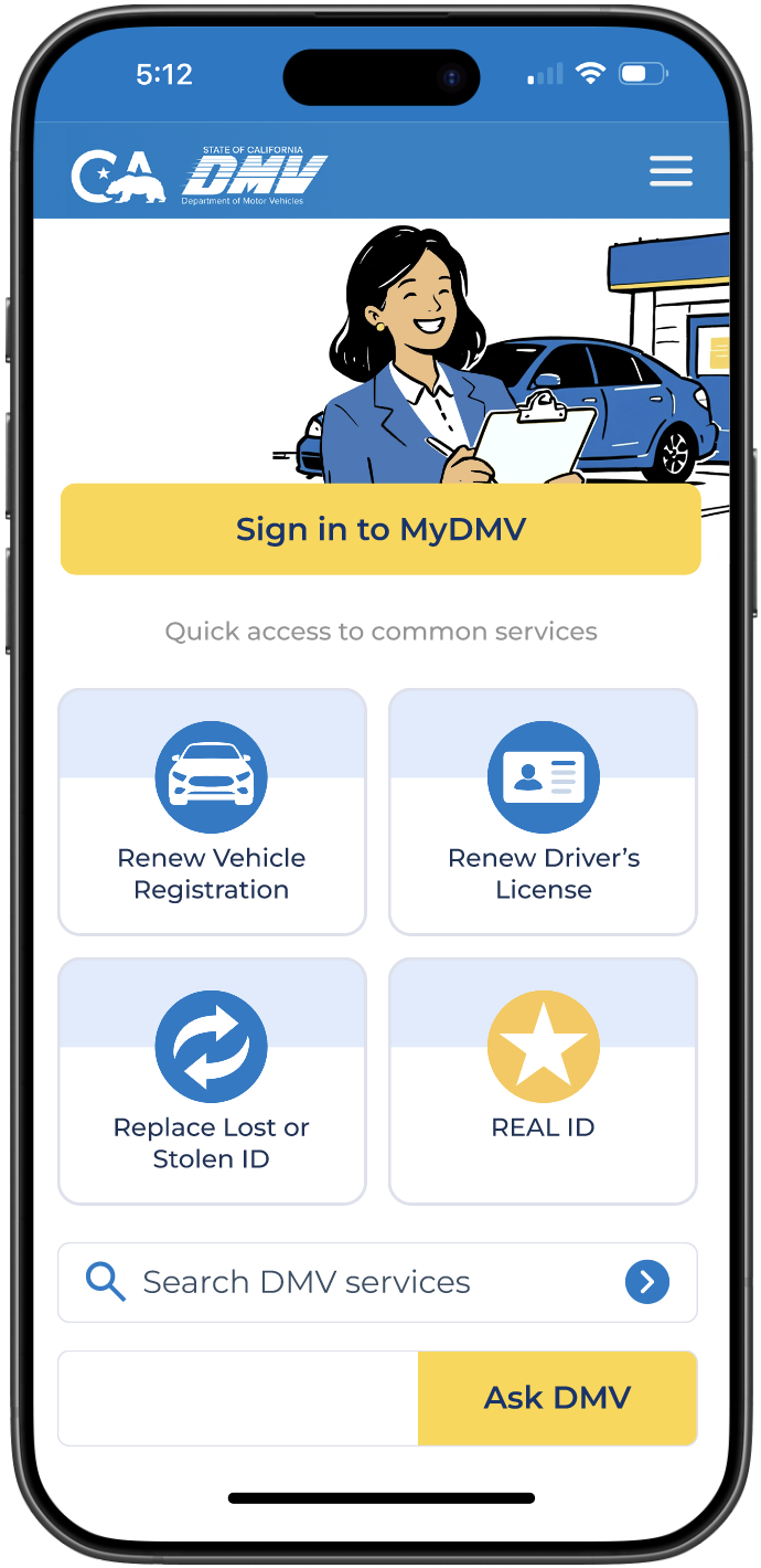 The mobile homepage focuses on high frequency DMV tasks, surfacing essential services up front to help users complete actions quickly without unnecessary navigation or cognitive overload.