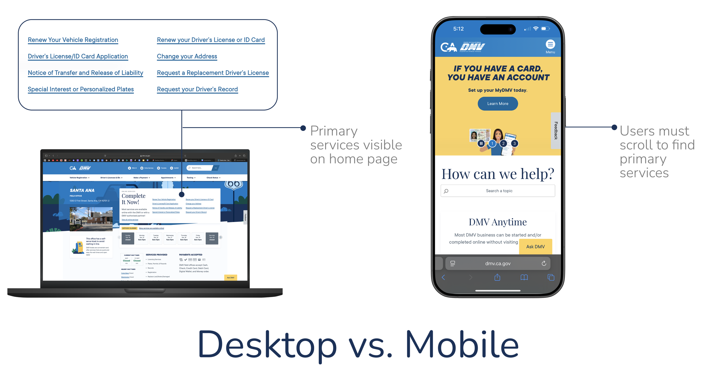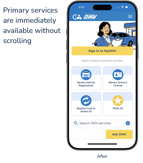 How might we redesign the Santa Ana DMV mobile homepage to surface high priority services immediately, without overwhelming users with unnecessary options?