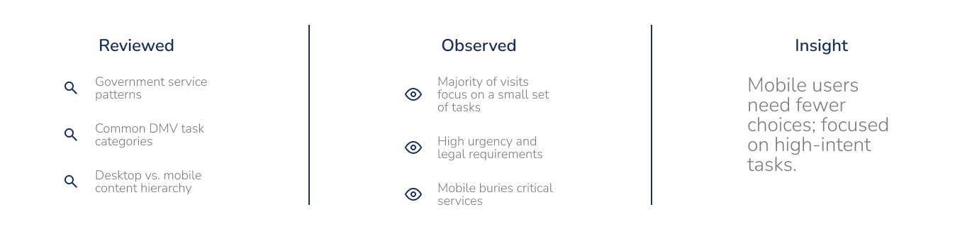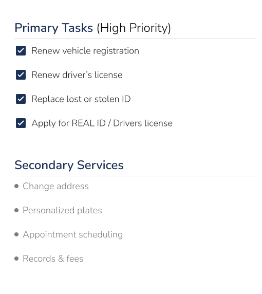 To understand what users most commonly visit government websites for, I reviewed publicly available government service patterns, common DMV task categories, and the content hierarchy across desktop and mobile experiences.